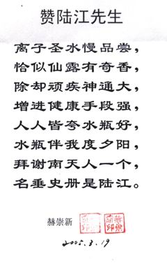 3. 詳細(xì)了解請(qǐng)上網(wǎng),可見臨床報(bào)告,鑒定證書、專家評(píng)說(shuō)、治病機(jī)理、用戶反饋、題詞、詩(shī)歌、錦旗等彩色掃描件,被譽(yù)為"神奇水瓶"。