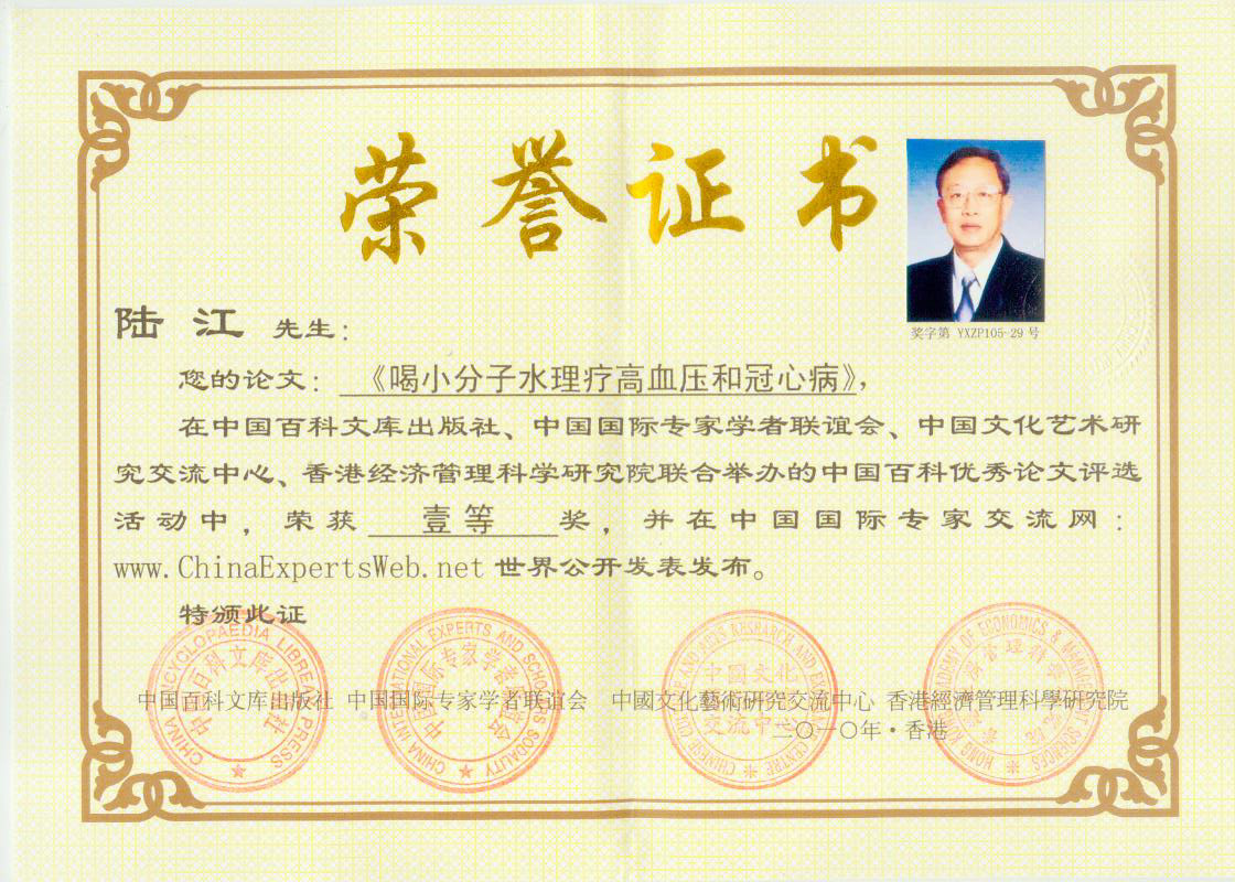 -----我是從事建筑的高工,本來(lái)沒有資格去攻克醫(yī)學(xué)難題,卻為了自身健康才扣響醫(yī)學(xué)的大門。由于我1990年患高血壓,因怕中風(fēng)才研究發(fā)明了離子水瓶,我把水處理成微小分子團(tuán)水,飲用后治愈了高血壓。便于1993年底送到三家省級(jí)醫(yī)院做臨床試用4個(gè)月。經(jīng)北京和廣西醫(yī)學(xué)專家鑒定:"降脂降壓效果好"," 能擴(kuò)大心腦動(dòng)脈流量,改善心腦電圖以及微循環(huán)","對(duì)治療心腦動(dòng)脈粥樣硬化、高血壓、高血脂有良好的醫(yī)療保健作用。""產(chǎn)品的技術(shù)性能和療效達(dá)到了同類產(chǎn)品的國(guó)內(nèi)領(lǐng)先水平,經(jīng)廣西醫(yī)學(xué)科學(xué)情報(bào)研究所檢索,未見國(guó)外有類似報(bào)道。"中國(guó)醫(yī)學(xué)科學(xué)院張正國(guó)教授從美國(guó)國(guó)立醫(yī)學(xué)圖書館數(shù)據(jù)庫(kù)存Medline檢索英俄文資料,均未見類似報(bào)告。2000年上市后,我為了對(duì)消費(fèi)者負(fù)責(zé)而繼續(xù)觀察研究,一直通過(guò)《信譽(yù)卡》和《質(zhì)量跟蹤調(diào)查書》向患者承諾療效,請(qǐng)用戶使用6個(gè)月后反饋效果。和脂壓患者飲用2至5個(gè)月內(nèi),消除癥狀,停服藥物,血壓正常;冠心病患者飲用3~5個(gè)月逐漸減輕至消除心絞痛、房顫等癥狀,不再服藥,飲用1年左右心電圖正常,經(jīng)冠脈造影掃描無(wú)明顯狹窄,表明冠心病痊愈。大量患者還反映許多衰弱器官被修復(fù),讓前列腺增生、慢性咽喉炎、慢性氣管炎、支氣管炎、慢性胃炎、腸炎和膽囊炎等不藥而愈;2型糖尿病患者是因?yàn)橐葝u衰弱致病,飲用該水半年至一年,逐漸減藥至停藥,血糖尿糖正常,真正治愈2型糖尿病。中風(fēng)后遺癥患者飲用六七個(gè)月,可逐漸減輕至消除肢體和語(yǔ)言障礙,表明飲用該水能讓壽命很長(zhǎng)的神經(jīng)元細(xì)胞逐漸修復(fù),奇跡般地恢復(fù)肢體和語(yǔ)言功能。飲用后還使胸腺和脾臟兩個(gè)重要的免疫器官被修復(fù)和增強(qiáng),產(chǎn)生免疫細(xì)胞多,提高了免疫力,使人不生病或少生病。自此, 飲用微小分子團(tuán)水創(chuàng)造了攻克冠心病、高(低)血壓和糖尿病三大醫(yī)學(xué)難題的奇跡。人們對(duì)此感到不可思議,但實(shí)踐是檢驗(yàn)真理的唯一標(biāo)準(zhǔn)。